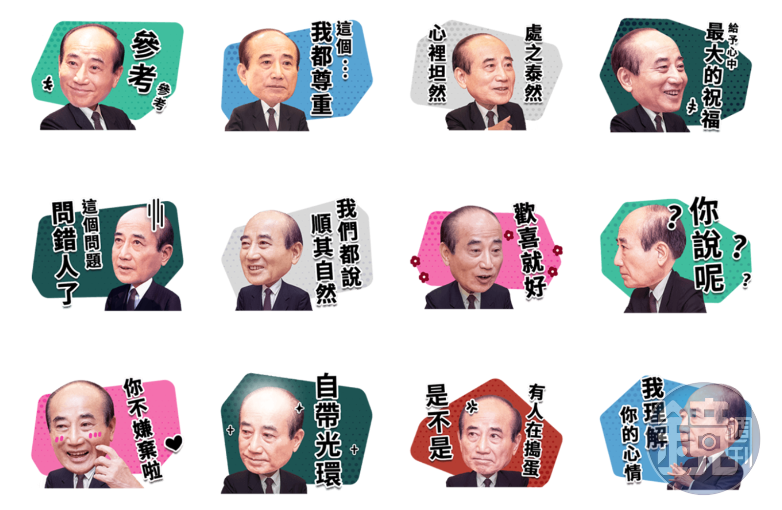 王金平貼圖則是用王的大頭照,有些加了腮紅,有些則是問號,其中更有一個在王金平頭上加了生氣的符號,寫著「有人在搗蛋是不是」,相當逗趣。
