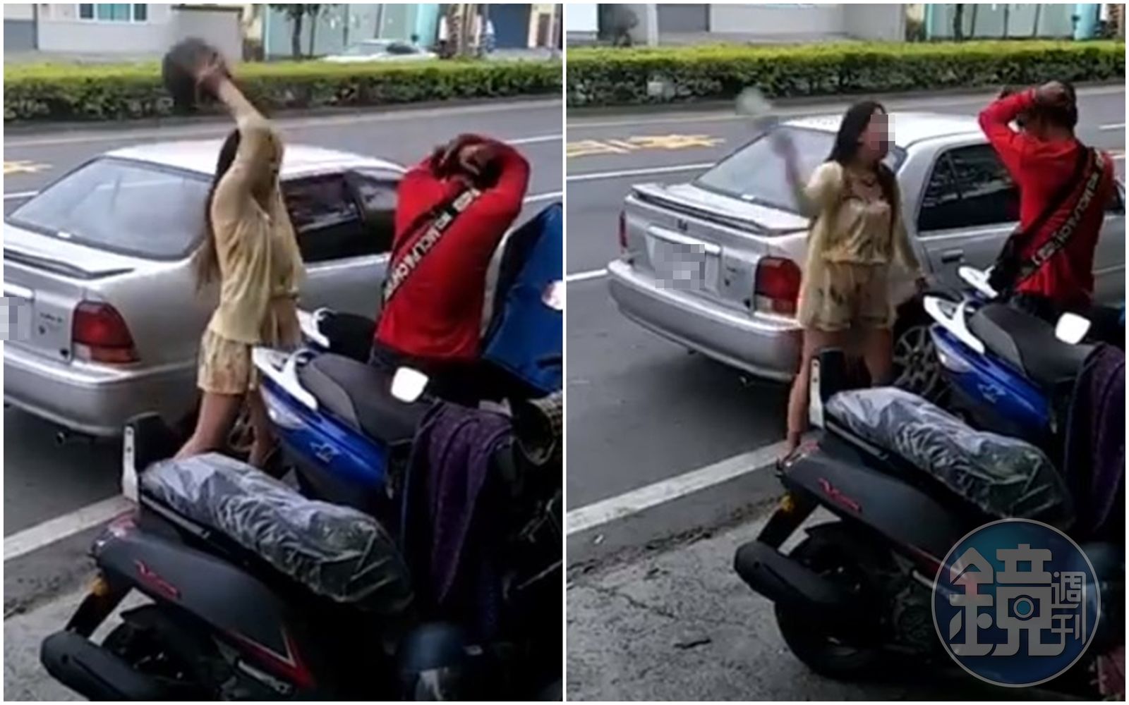 沒想到女方聽完後更加火大反問「什麼叫做我欺負你?」徒手連續再賞9個巴掌後,再次怒嗆「你是媽寶嗎?我也是有兄弟的。」她隨後拿起一旁的安全帽直接朝男友頭部猛K,男方只能無奈以手遮擋頭部。