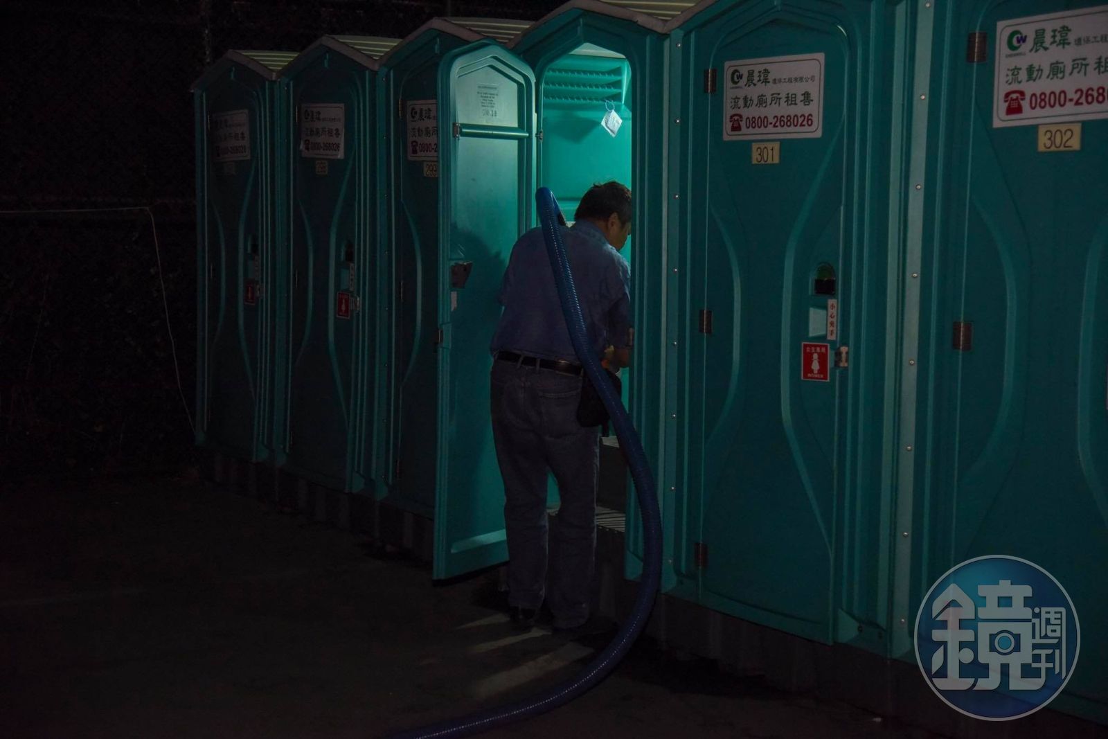 除了接駁車司機努力送走每一位遊客,當遊客回到家躺在床上時,另一批身影在黑暗中,開始接力工作。潘孟安表示為讓賞燈遊客「方便」,燈會的廁所是採最高標準設置,數量、清潔、位置、品質均嚴格把關,「800多座流動廁所必須在人潮退去後才能執行水肥清除,早在一旁等待入園的水肥車,需在短短數小時內抽除水肥,是項極為吃力的任務。」