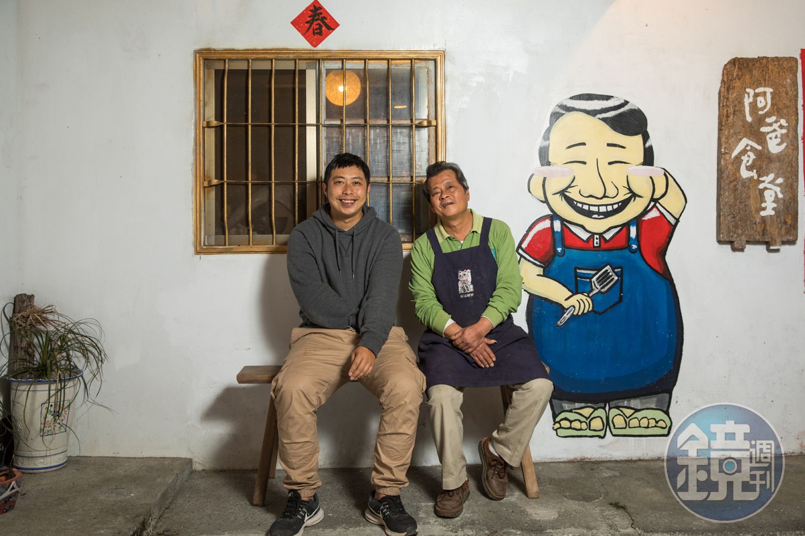 話匣子漸漸打開的劉俊豪,講起阿爸食堂的空間擺設,每個物件都有不同的小故事。比如擺著一張圓桌,上面寫著「員」字的那間,是劉爸爸取好兆頭,象徵團圓特別找來的餐桌,但劉俊豪卻說,他本來想買個中間有寫圓字的方桌,要跟劉爸爸唱反調;而塗鴉在正廳左右兩側牆面的青龍與白虎,則是打工換宿小幫手的作品,沒想到意外的搭配,超有氣勢,很符合劉俊豪的期待;另外兩幅掛在咖啡店裡,栩栩如生的小狗畫像則是出自客人之手,惹得他說:「如果沒有透過繪畫,我可能永遠都不知道他們這麼有才華!」