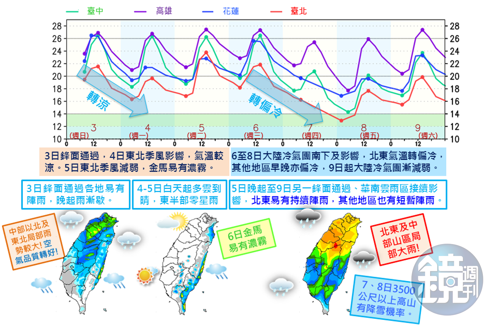 根據中央氣象局表示,週一(4日)、週二(5日)全台各地天氣大致穩定,北部氣溫將回升至24至25度,中南部日夜溫差大。週二晚間起至週末,一波鋒面通過台灣,再加上華南雲雨區持續東移影響,各地天氣不穩定,北部及東北部將出現局部大雨機率。