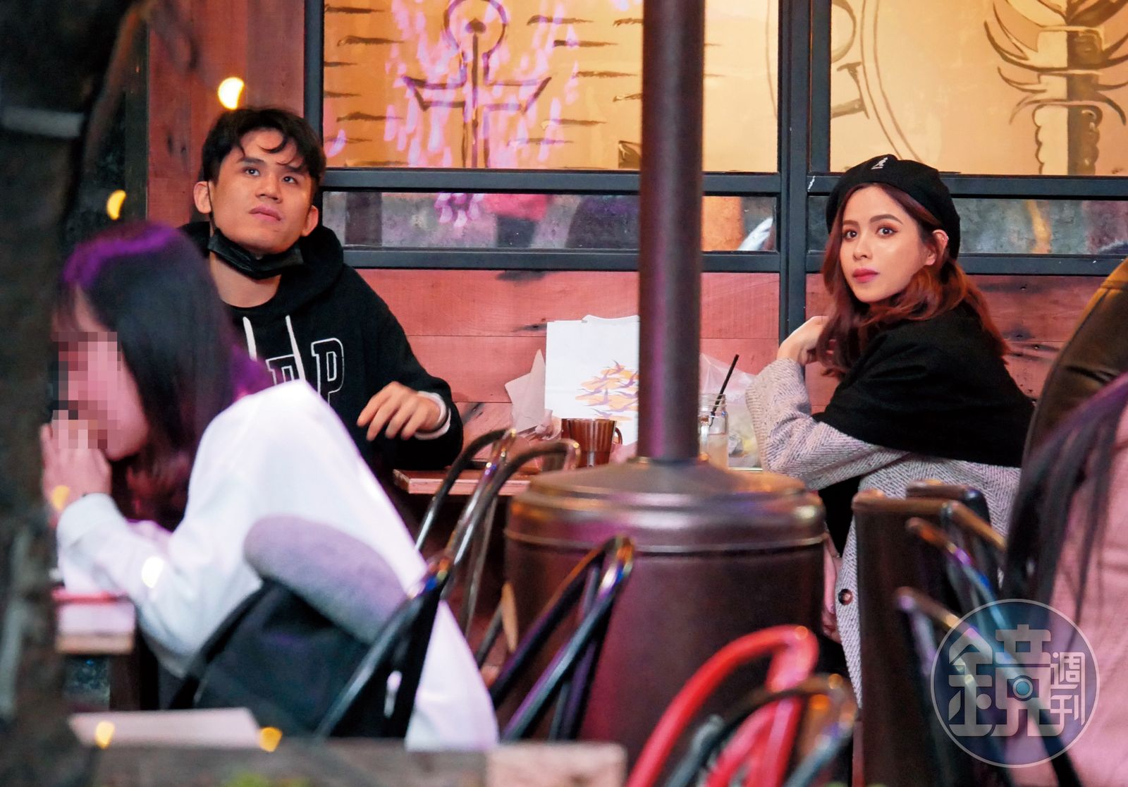 小倆口似乎對南山微風吃的沒太大興趣,又默默晃到信義威秀的「龍波斯特」,兩人坐下來後,刻意裝得像陌生人一樣,各自玩自己的手機,偶爾吃一下剛剛買的零嘴。原本默不作聲的黑衣口罩男,忽然把一個小餅乾弄好拿給Nikki,Nikki看到他的貼心,也乖乖張口把餅乾吃下。
