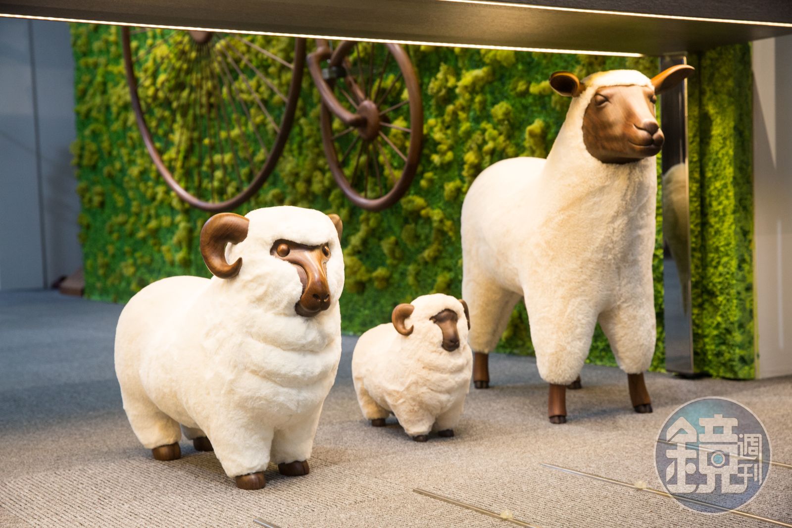 「我們做了很多動物家飾品,但主題都是可愛型動物,像綿羊、大象還有小豬。」拿著羊咩咩家族中的小羊,牡羊座的曹憲章笑得開懷。他解釋,綿羊主體為生產木皮板剩下的胡桃實木,外層則包裹棉料,每次一推出都非常搶手。