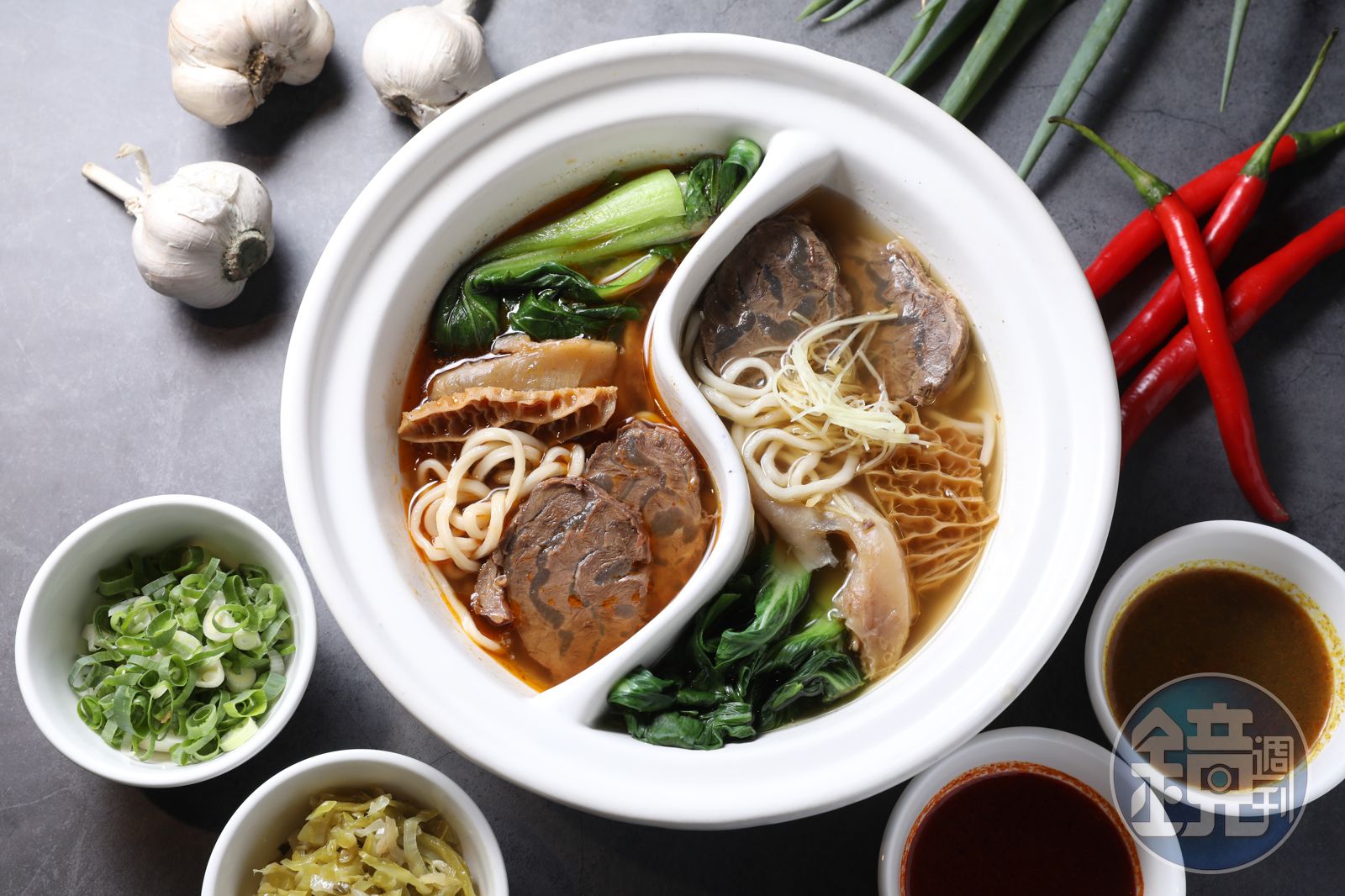 玩心很重的易哥,有了太極牛肉麵在手還不滿足,他今年在八德路上開了旗艦店,交棒給兒子許賀凱,賣起「八卦火鍋」,把牛肉麵拆解再重組成清燉和紅燒湯頭的鴛鴦鍋,涮起牛筋、牛腱、牛肚唇和火鍋料,這種吃牛肉麵的形式,也真的是僅此一家別無分號了。
