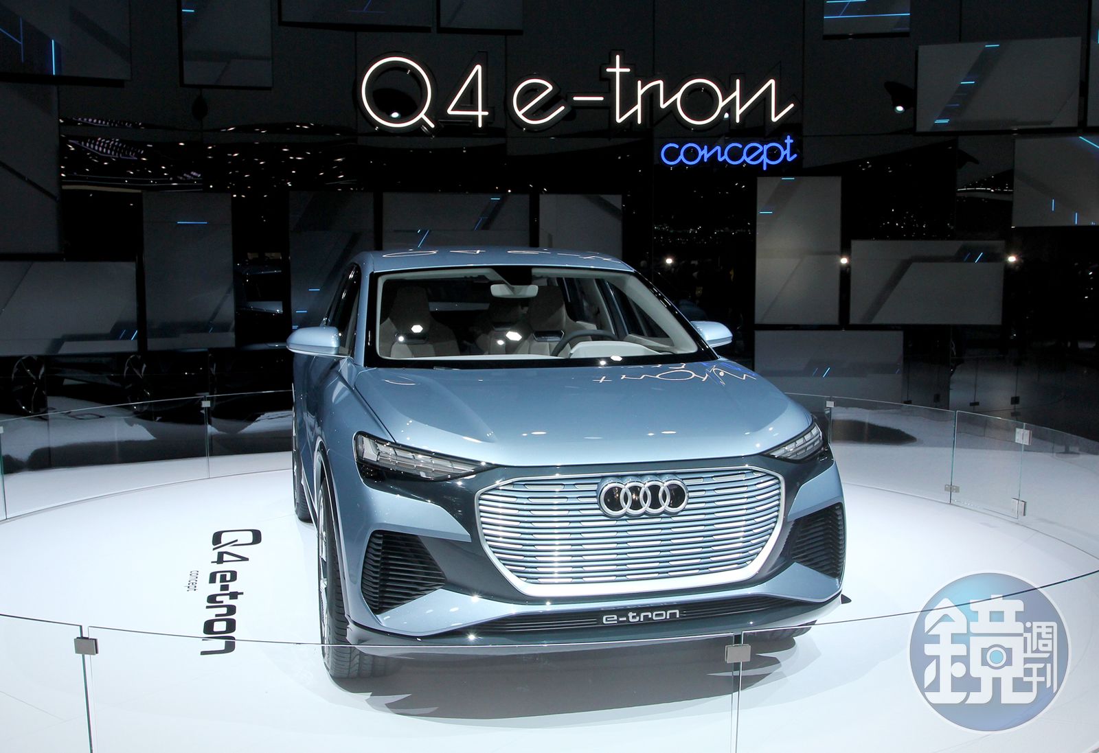 外觀部分則承襲了 e-tron 系列的特色,水箱護罩採用封閉式設計(因為散熱需求降低),前保桿兩側與下方的進氣口則化身為主進氣道。車側線條則與 Q8 有幾分神似,甚至輪拱處也像 Q8 一樣外擴式,增添了不少的動感與剽悍。動力部分則以 MEB 平臺架構為基準,採用前後各一具電動馬達的四驅配置,後軸配置 150 kW(204 匹馬力)馬達、前軸則為75 kW(102 匹馬力),中央地板則安裝上 82 Kw容量的電池組,以 WLTP 測試基準續航力450 公里以上,可對應125 kW 快充系統,所以儘需30分鐘即可充電80%,Q4 e-tron Concept預定2020年正式量產上市。