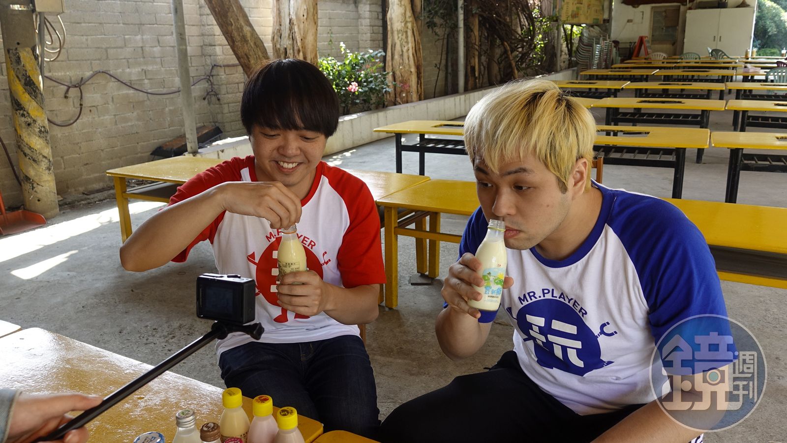 工作人員大力推薦必經行程裡,達爾與小李也一同前往「豐新鮮兒童教學」牧場,享受羊群中擠羊奶的樂趣,2個大男孩在牧場人員指導下,邊擠羊奶也品嘗了在地新鮮的好滋味,其中有「蜂膠口味」的羊奶美容滋養,多喝能幫助身體水噹噹,讓2位「行男(行走的男人)」立刻一次喝了4瓶,除了一口氣打破自身紀錄,妙喊:「現在開始請寫我們是『型男』!」