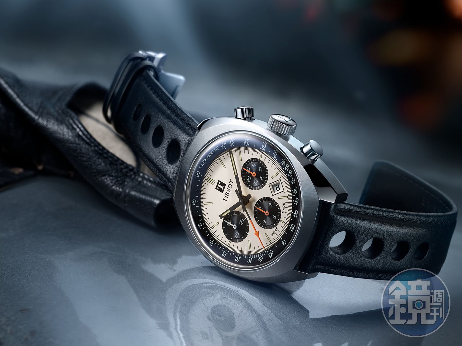 Heritage 1973計時碼錶不管是殼型、老式蘑菇造型的計時按把,又或者是穿孔的賽車錶錶帶樣式,都有著古董賽車錶的老味,甚至是天梭的Logo還採用當年的樣式,至於箱型的鏡面也更添古味,不過是換成更耐用的藍寶石水晶材質,至於錶徑調整為43mm以符合現今的配戴需求;另外像是錶殼正面與側面的打磨處理,甚至是鍍金的自動盤,都是相當漂亮的細節。