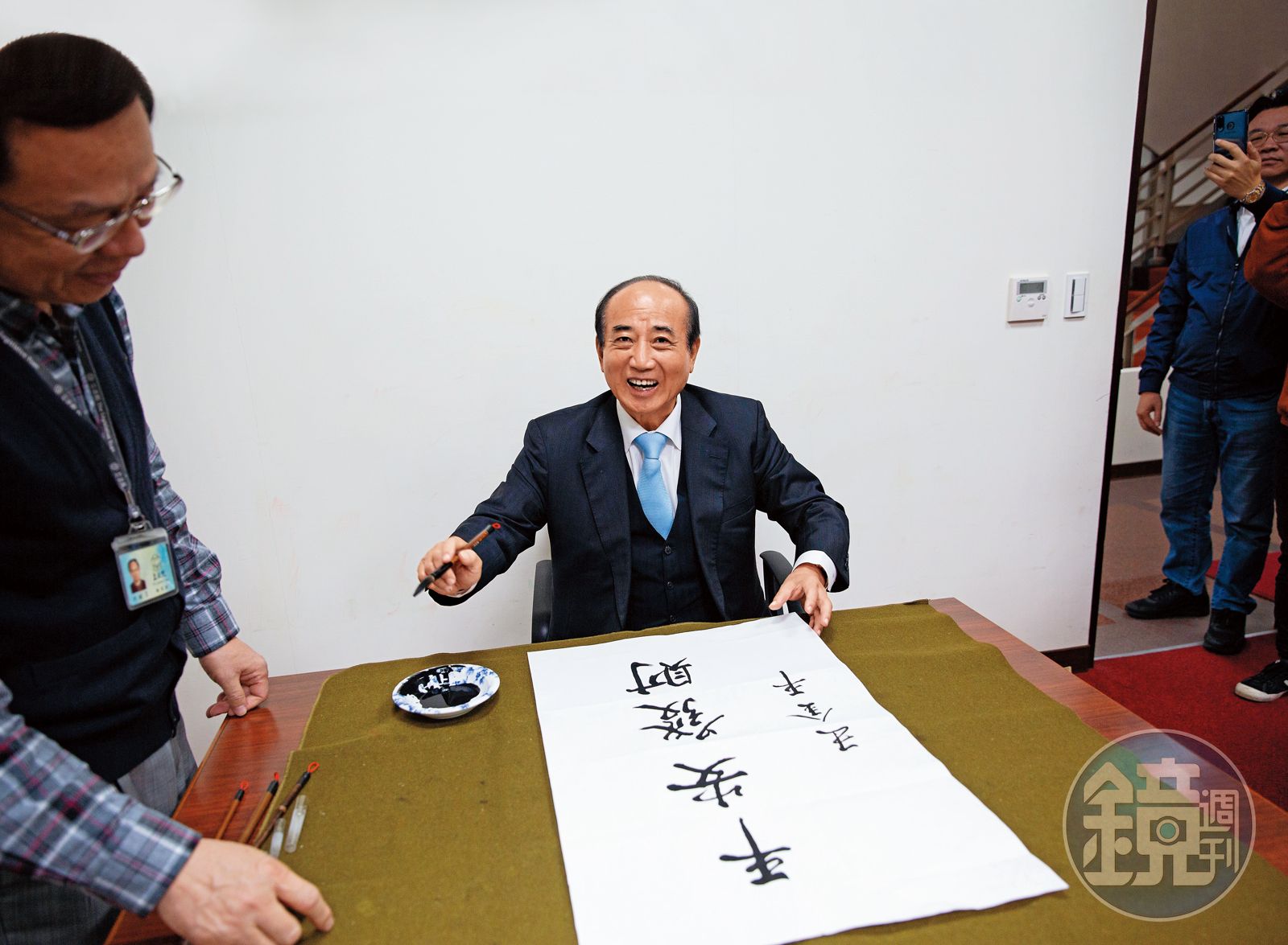 我們視線轉向另外一堵牆,上頭掛著佛濤大師相贈的書法,寫著「無罣礙」3個字,忍不住又問:「牆上掛著無罣礙,但您要出來選總統欸…」