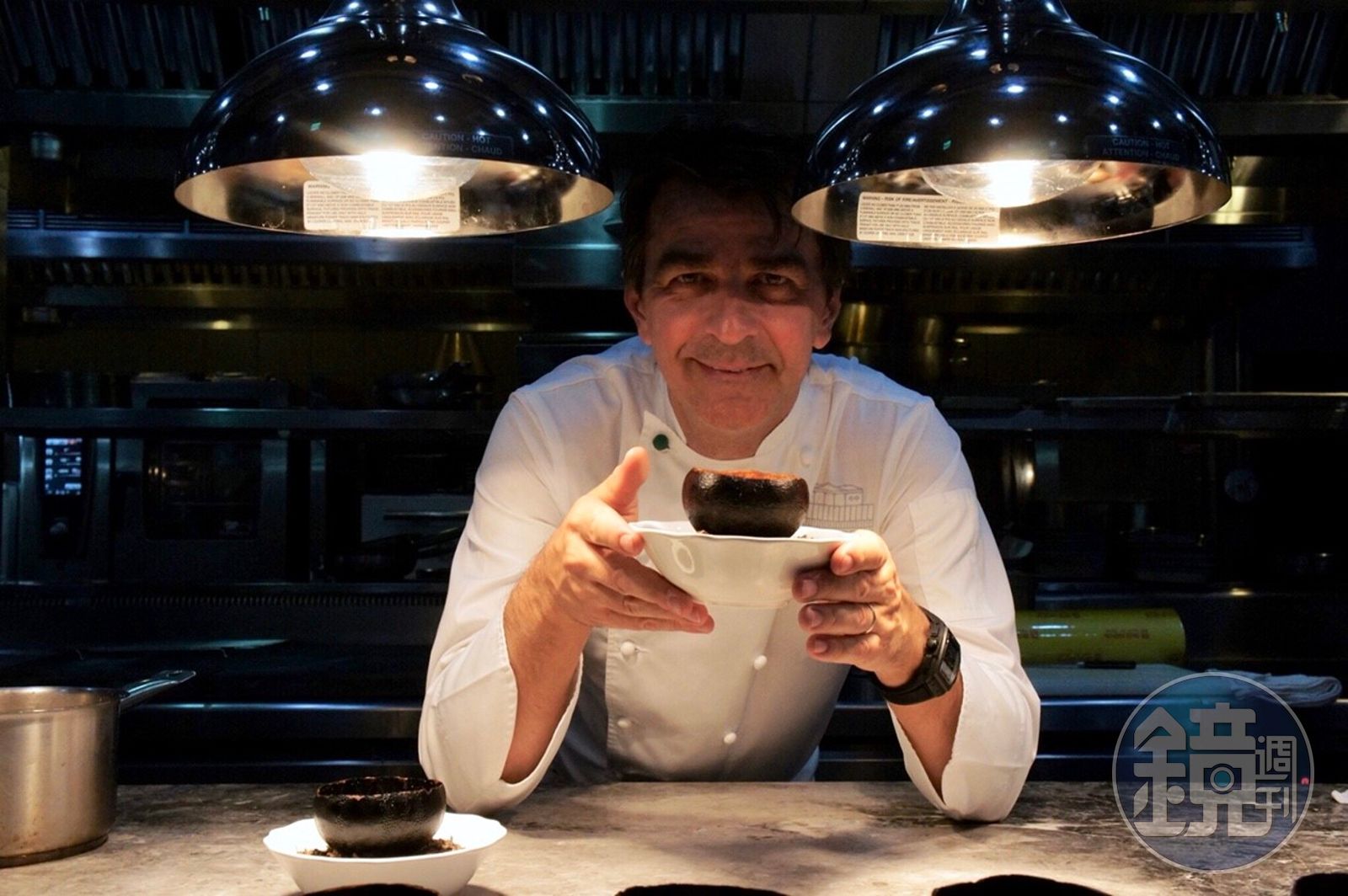 黑壓壓的烤葡萄柚盅當成食用容器,烤乾的果皮薄脆,像是剖半的深咖啡色小椰子,帶煙燻味,盛裝以海膽內臟、西芹根、蕪菁熬煮的海膽湯,「吃的時候要用雙手捧著烤葡萄柚盅直接喝湯。」這是邊角食材的新表現,滋味有新意,加上有料理論述,這是大廚本事,能把原本要被丟掉的食材升級成米其林料理。