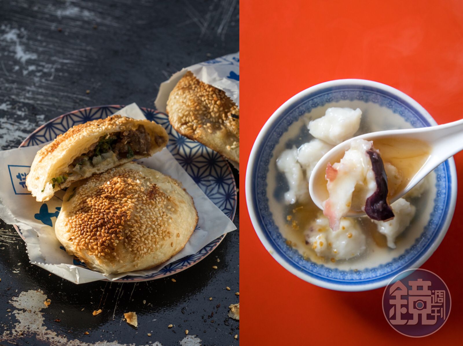 每到下午3點左右,龍門胡椒餅火星四射的烤爐前就排起人龍,餅一出爐立刻被夾起套袋,一天平均賣出700顆,天氣越冷生意越好。老闆選用黑毛豬的後腿肉,肥瘦比例1比2,加入黑胡椒、白胡椒及五香手工拌攪,老麵發酵的麵團加入油酥層疊撖平,大把的抄起肉餡、沾裹脆甜三星蔥,包得飽滿。