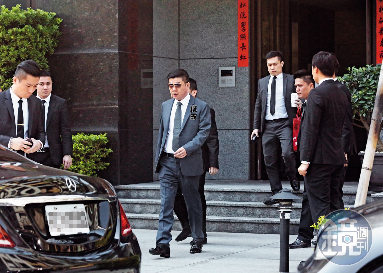 3月12日上午11點半,台北市內湖區一棟社區大樓外,3輛黑頭車一字排開,多名身穿黑色西裝的男子在旁待命。不久,1名穿藍灰色西裝、戴墨鏡的中年男子,氣勢十足地步出大門,並在一群黑衣西裝男簇擁下坐上中間的賓士車,隨後3車一同駛離,往高速公路開去。