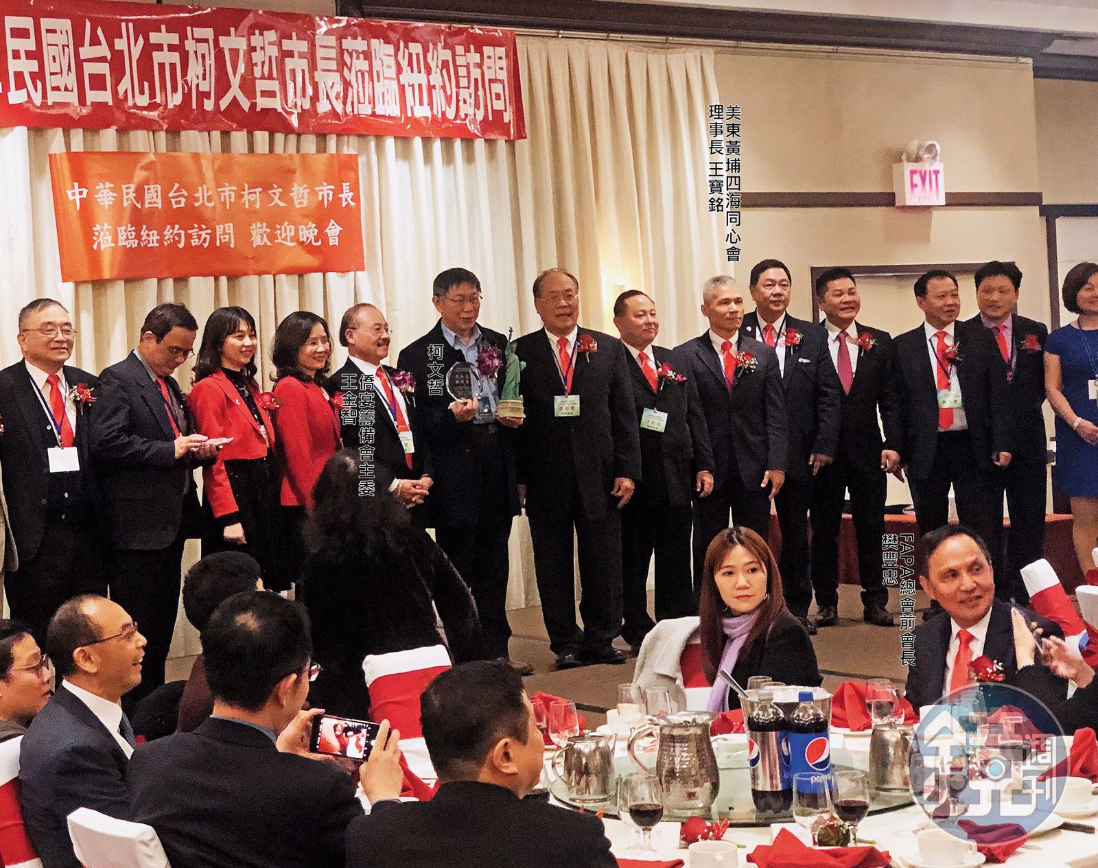本刊調查,美國時間17日晚間的第一場紐約僑宴,出席的不但在美台僑、台商居多,且背景橫跨藍綠。僑宴由僑務委員王金智擔任籌備會主委,包括美林銀行副總裁、紐澤西台灣商會理事汪俊延,以及國際獅子會紐約法拉盛分會的會長翁雅琳、監事白育青、財務總監王理仁都是籌備委員,綠營背景如在獨派極有影響力的FAPA(台灣人公共事務協會)總會前會長樊豐忠不但出席僑宴,還與柯一同坐在主桌,台灣同鄉會成員、醫師溫碧謙甚至特地從西雅圖飛來紐約參加。