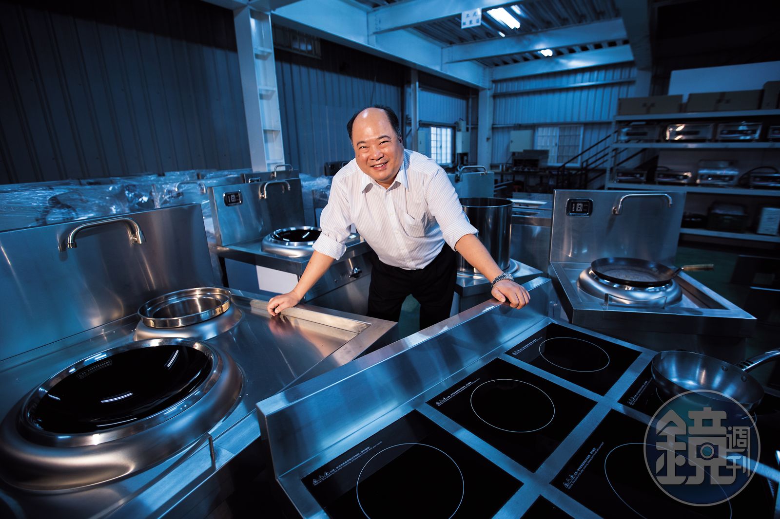 林永祥操著台灣國語,笑瞇瞇地介紹各式電磁爐,「這個大炒爐30千瓦,中央廚房用的,保五總隊就是用我們這個爐。」說完,他指著高牆上一塊紅白招牌,中間是洋文,底下寫著「興龍牌」,「我家本來就是做『大電』的,電風扇那種就是小電。」2012年轉型做商用電磁爐的興龍機電,原是老字號興龍牌電熱水器,至今已有52年歷史,「我們算是台灣第一個做電熱水器的,現在還有賣,只是買的人少很多了。市場後來很亂,也終究敵不過櫻花這些大廠…」