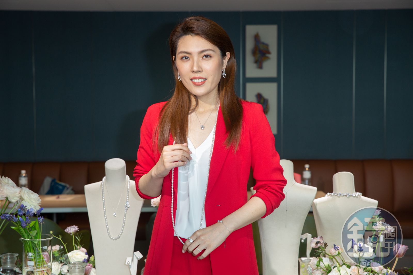 雖出席珍珠活動,但她坦白表示自己沒有珠寶收藏,「平常我只戴婚戒,如果有場合需要,會跟媽媽借。今天是我人生中配戴最多件珠寶在身上的日子,我對於珍珠鑽石花瓣手鍊特別喜歡,覺得玫瑰花瓣很有動態感,加上珍珠設計成可以移動,我就一直玩。」