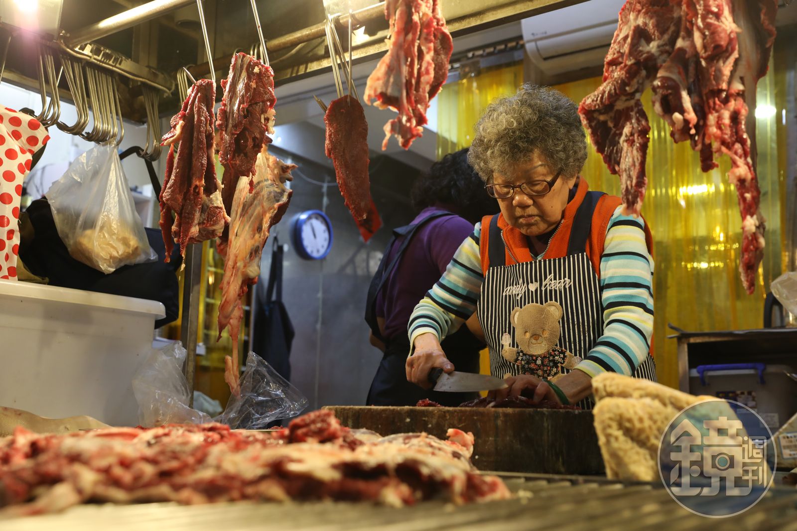拎好雞里肌一轉身,在「牛肉界」很有江湖地位的「萬國牛肉」攤前人聲鼎沸,大過年後,牛肉攤休了10天長假,採訪這天他們新春開工,老客人全趕來搶肉。86歲的老闆楊鳳嬌在攤頭前精神奕奕,持刀解牛,她的女兒劉美蘭忙著提給客人「牛前腿五花腱」、片好燙熟的「牛筋片」,以及客人特別交代的「牛小排」。