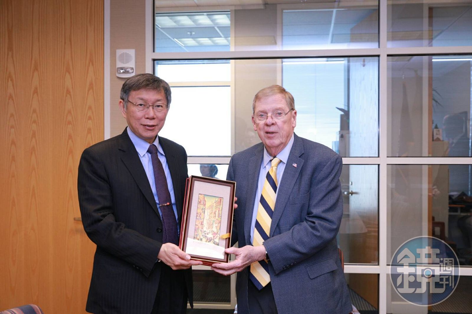 柯文哲昨(21日)見證台北市進出口商業同業公會與美國亞特蘭大最大民間商業組織「大亞特蘭大商會(Metro Atlanta Chamber)」共同簽署合作備忘錄,隨後並拜會喬治亞州共和黨籍聯邦參議員Johnny Isakson(強尼·艾薩克森),喬治亞州州檢察長Chris Carr也特別與會。強尼·艾薩克森是聯邦參院台灣連線(Senate Taiwan Caucus)成員,過去曾訪問台灣,長期以來也對台灣表達支持。