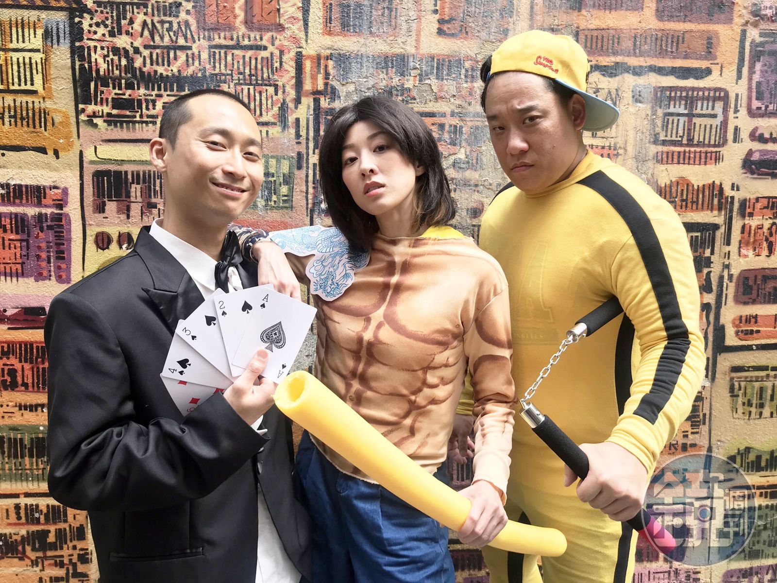 浩子(左)扮成「周潤發-賭神」,夏語心(中)扮成「銅鑼灣扛霸子-陳浩南」,阿龐則打扮成「李小龍」,一行人去中環壁畫打卡熱點「九龍城寨」拍照。(民視提供)發布時間:2019.03.28 13:33 臺北時間