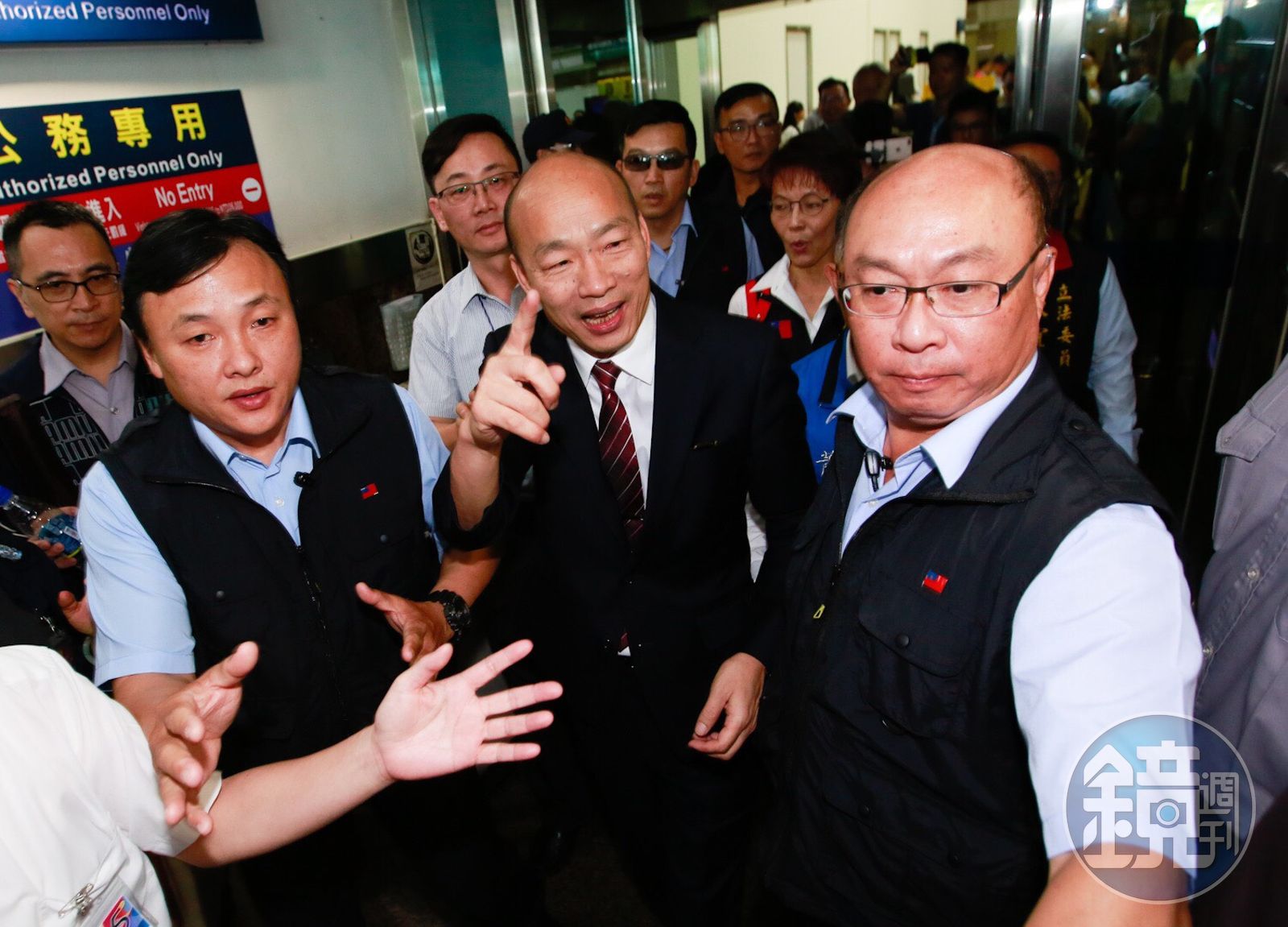 昨(28日)韓國瑜結束訪中行程返回高雄,大批支持者聚集小港機場接機,現場更不時有人高喊「選總統!」等口號,為了讓支持者可以清楚看到韓國瑜,身旁2名隨扈將他高高舉起,韓國瑜也熱情揮手致意。