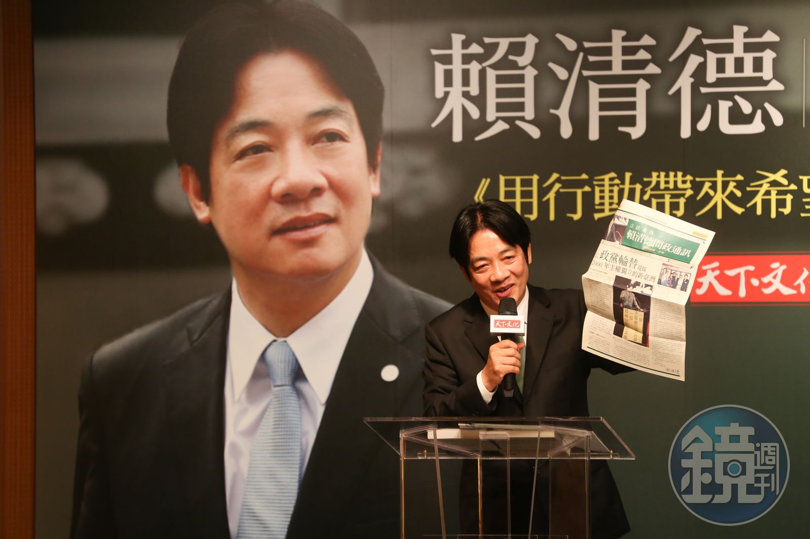 談到新書,賴清德特別強調,這本書不是為了選舉,事實上在他連任第二任台南市長時就有出書計畫,當時規劃的書名叫「大步向前」,比照第一本書「看見未來」都是競選時的主軸。不過因為原本規劃的作者和他都很忙,他到行政院擔任院長時,剛好新書作者郭瓊俐去專訪他,才請郭幫忙寫第2本書。沒想到九合一大選民進黨敗選,他辭職下台,才決定把閣揆的部分一併納入,「這本書並不是為了總統選舉的事情」。