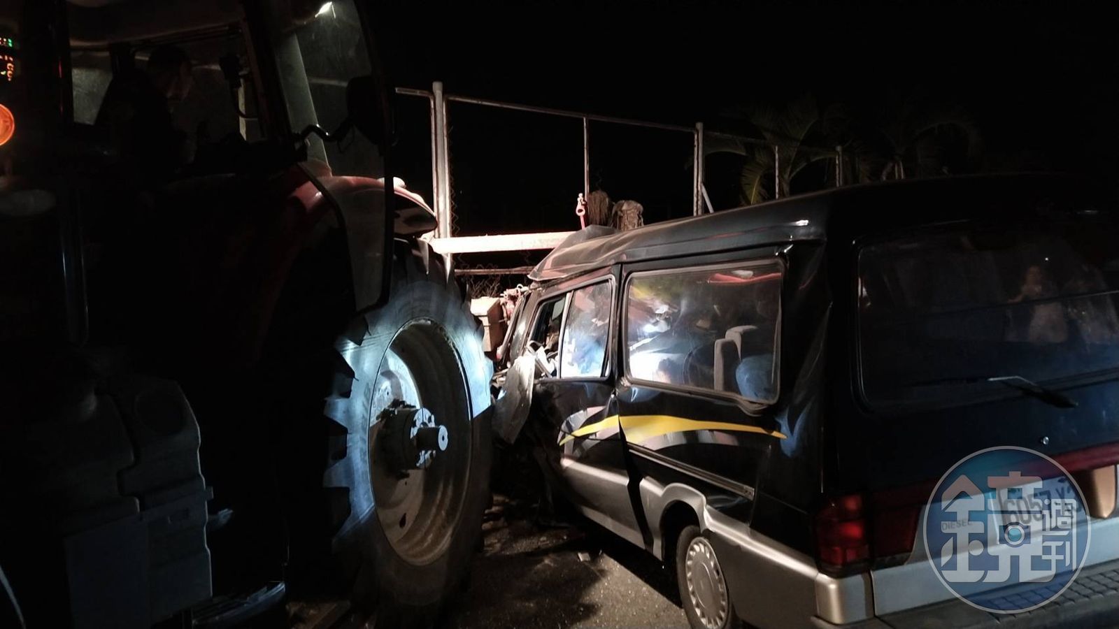 載有3名補習班學生的廂型車疑視線不佳撞上耕耘車,70歲的余姓駕駛當場身亡。(警方提供)發布時間:2019.03.30 11:15 臺北時間