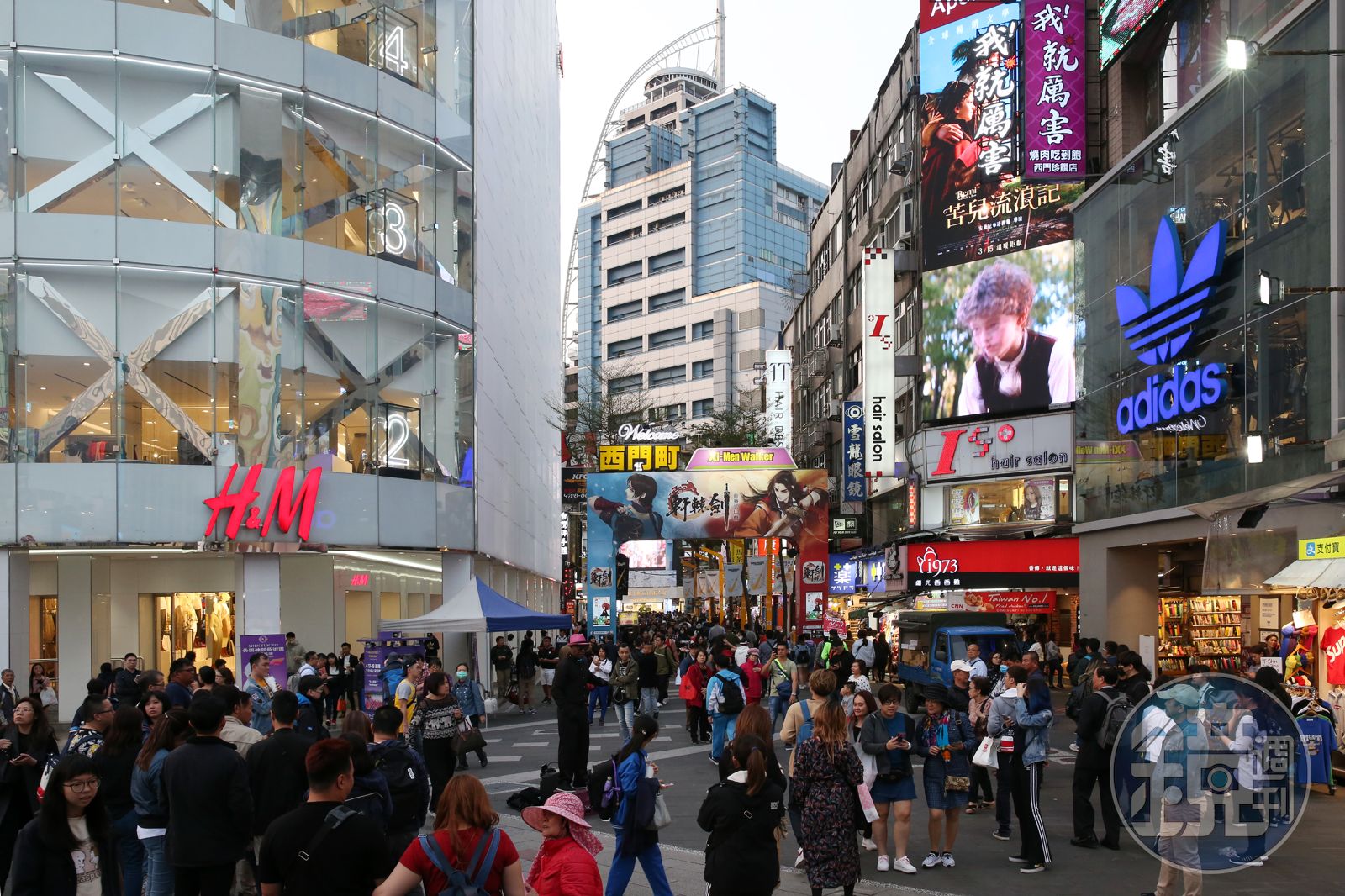 3月下旬的平日下午,走出台北捷運西門站的6號出口,從西門紅樓、漢中街,甚至是中華路一段上,放眼望去全是逛街人群。「現在才幾點而已,你看人多成這樣!」仔細觀察,有人拿起手機興奮地自拍、有人拖著行李箱問路,「這些人一看就是遊客,最會花錢的也是遊客。」經營北市店面市場多年的香港商匯泓不動產副總經理吳懿倫說。