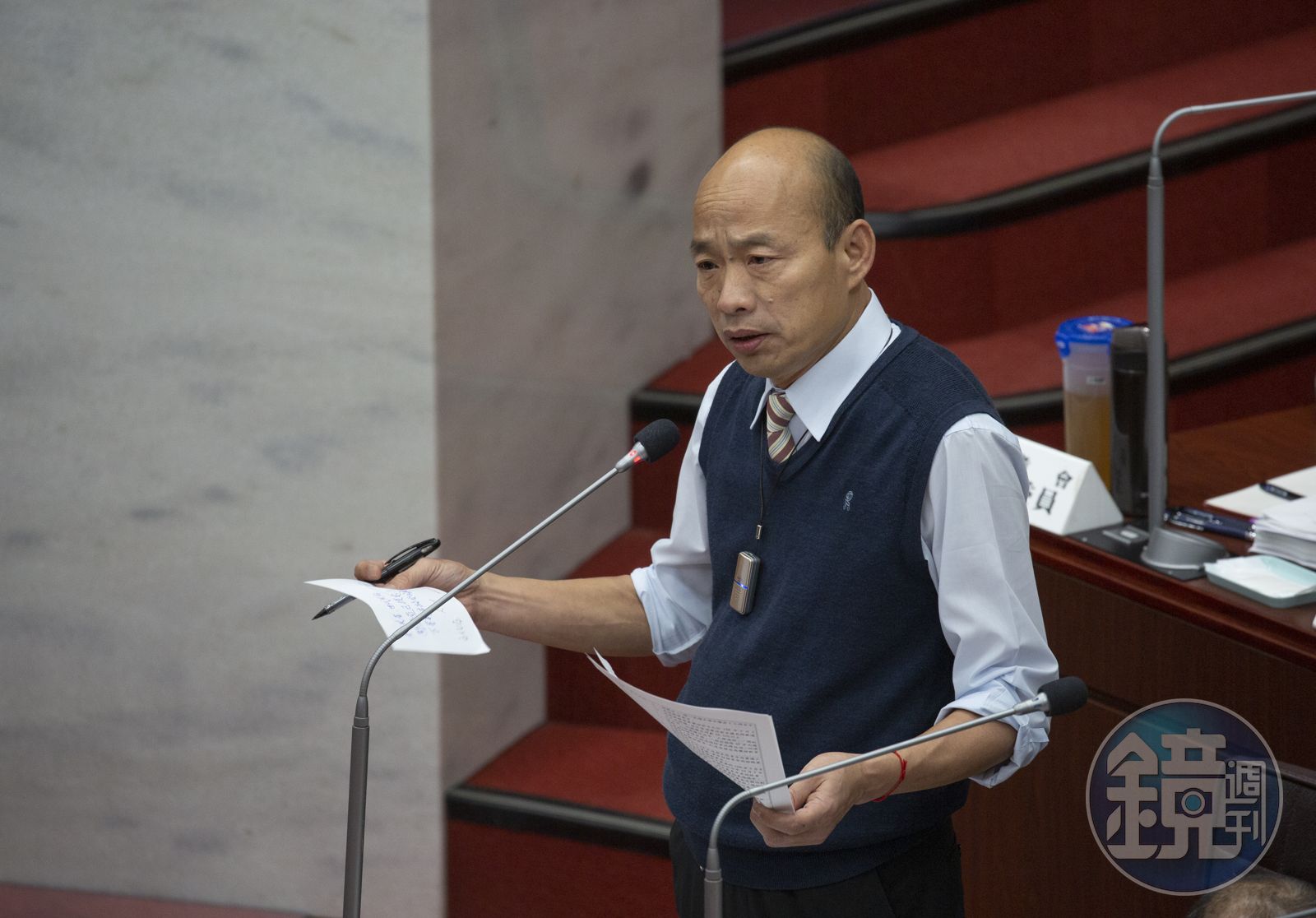 高雄市長韓國瑜昨(1)日被民進黨議員詢問是否將參選總統,他重申「目前2020不在我考量內」,至於若被國民黨徵召是否參選,韓國瑜則強調為假設性問題,「我不想把話講成這樣子。」遭綠營議員直呼,「你不想講死就對了。」隨後議員黃文益與李喬如更送上一件龍袍,諷刺韓在等「黃袍加身」,韓國瑜面癱搖手拒收。