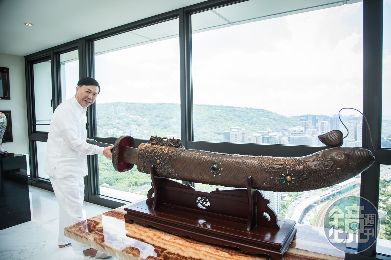 「這把刀從北京、上海、新加坡又拿回來。」立起來差不多一個人高的屠龍劍過去擺在上海「新紫禁城」私人展覽館,要用來斬奧客,現在可不隨便出鞘,「要忍耐,非到必要時不能用。」但老先生愛開玩笑,「如果老公劈腿欺負妳,我拿這把刀去斬小三。」