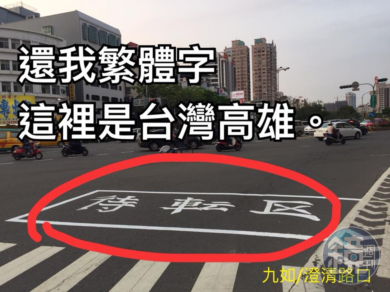 劉世芳昨在臉書上PO出一張照片指出,高雄的九如澄清路口馬路上的待轉區3字寫成「待転区」,要求「高雄市政府要不要出來說明一下?」,氣得直說「今天不是愚人節了吧?」並稱「也請有看到非繁體標誌的台灣高雄鄉親們,將資訊跟世芳分享」。