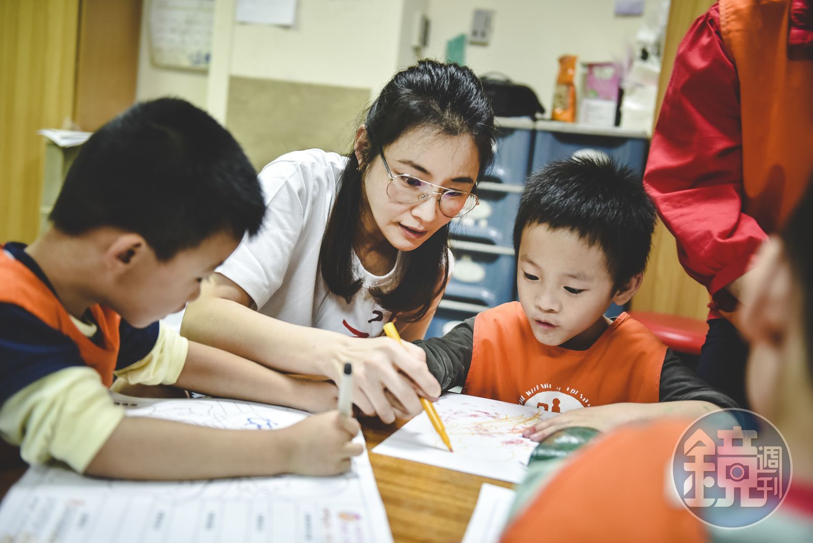 初為人母的陳怡蓉一心掛念著基隆早療中心的慢飛天使,去探望孩子們上課的課程中,看到老師配合春天節氣,利用樹葉帶領孩子進行美勞課,訓練孩子手眼協調及精細動作發展,都令她頗有感觸。其中,慢飛天使糖糖因認知理解較弱,不時向陳怡蓉投以求助的眼神。細心的陳怡蓉觀察到,馬上轉身換位到糖糖身旁,牽起小手引導,拿起樹葉沾染顏料拓印在圖畫紙,做出一隻又一隻可愛的毛毛蟲。陳怡蓉說,孩子的成長有無限的可能,只要及早發現孩子發展狀況,就能透過早期療育課程,幫助孩子趕上成長腳步。