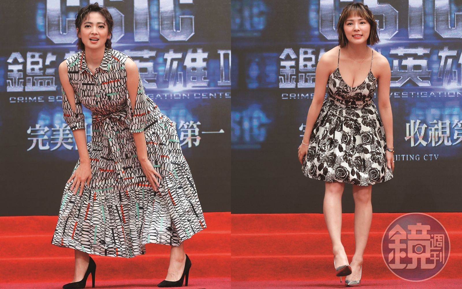 向來挺著一對G乳招搖的熊熊,出席《鑑識英雄2》首映會時,果然是倒奶老司機。穿得頗像的阿喜,領口比人家高,裙子也比人家長,雖然腰彎得比熊熊低,但就像個阿桑一樣!好歹阿喜也是號稱「宅男女神」,但危機意識很差耶!