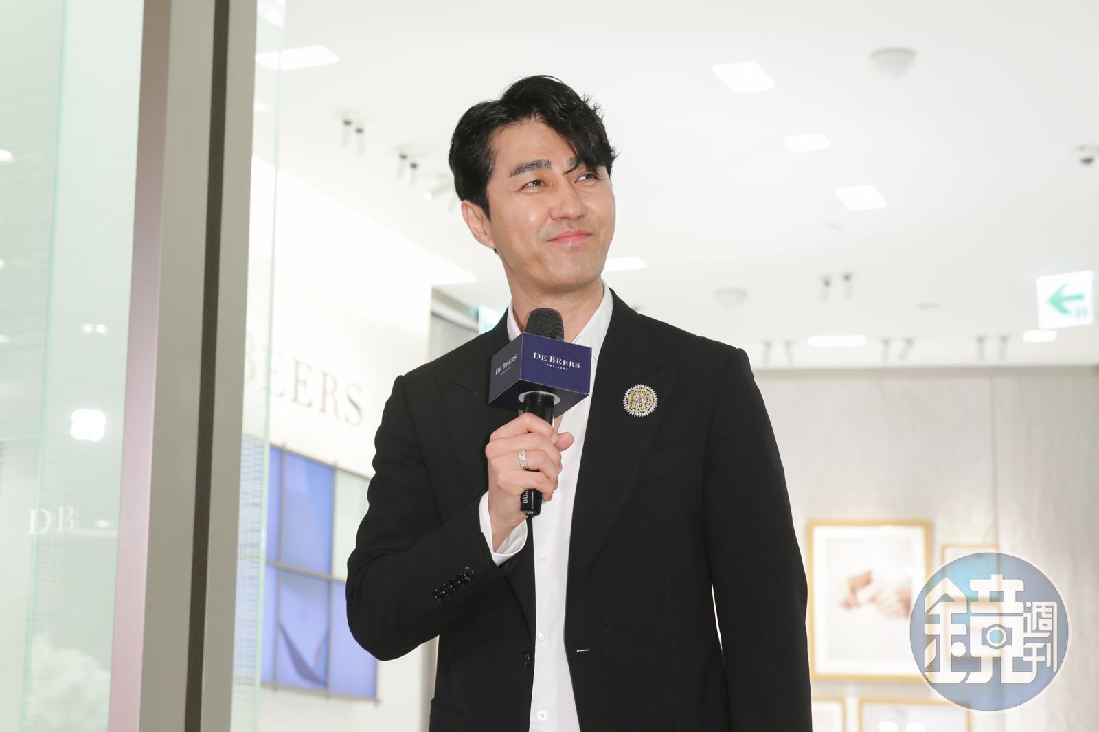 車勝元戴上De BeersDiamond Legends by De Beers系列Ra胸針,價值1,780萬元,貴氣十足讓平常喜歡簡單不浮誇配件的他今天不只一次讚賞胸針很好看,「鑽石是寶石之王,以前覺得鑽石只適合女生,但這次配戴這款胸針與戒指,蠻合適的。」