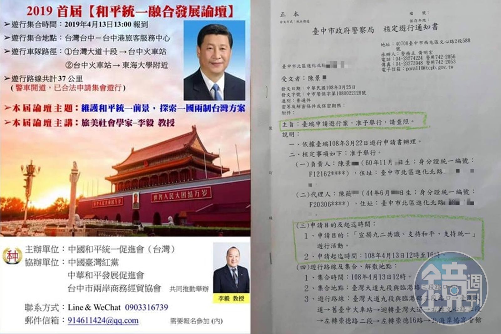 台中市警局今(11日)上午緊急召開記者會,澄清遊行宣傳單提到「警車開道」並非事實,並表示陳姓市民申請的「宣揚92共識、支持和平、支持統一」遊行,符合憲法與集會遊行法的相關規定,並無違反第四條「不得主張共產主義或分裂國土」規定的情形,因此予以核准。