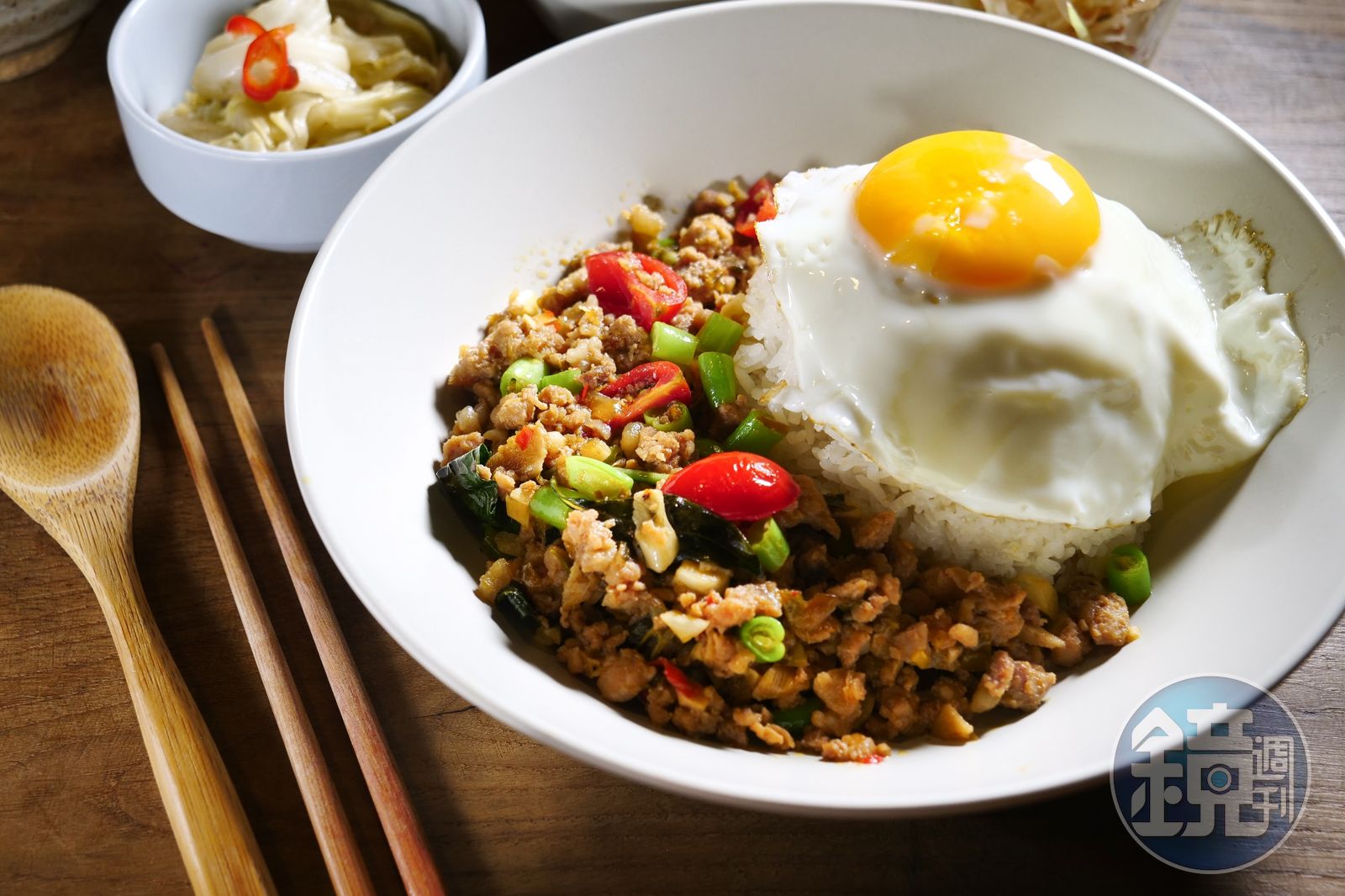最受歡迎的主菜「椒麻雞」,洋蔥上頭是炸得酥脆的雞塊,醬汁則調整成一般人可接受辣度的酸辣醬;另一道主菜「打拋豬」也十分誘人,上頭放一顆荷包蛋更添美味。