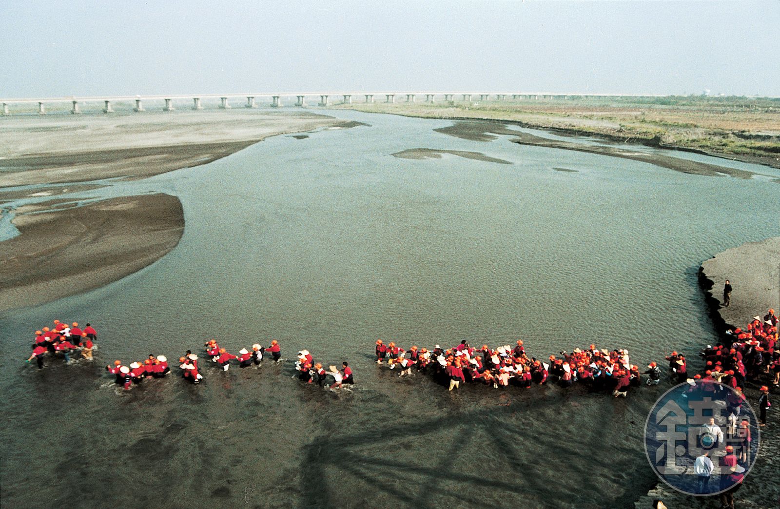 那年轎班感應到媽祖不想走橋,而是要走橋下涉水。「媽祖蹽溪有個功能性,我們用肉眼看不出跡象,但祂就是渡人跟渡無形的東西。」他說的玄妙,但蹽溪的困難卻很真實:「濁水溪有30公分是爛泥巴,底下是流沙,你這個腳沒有跨越第二步,人站在原地會慢慢沉,沉到這個人不見,是蠻危險的。」