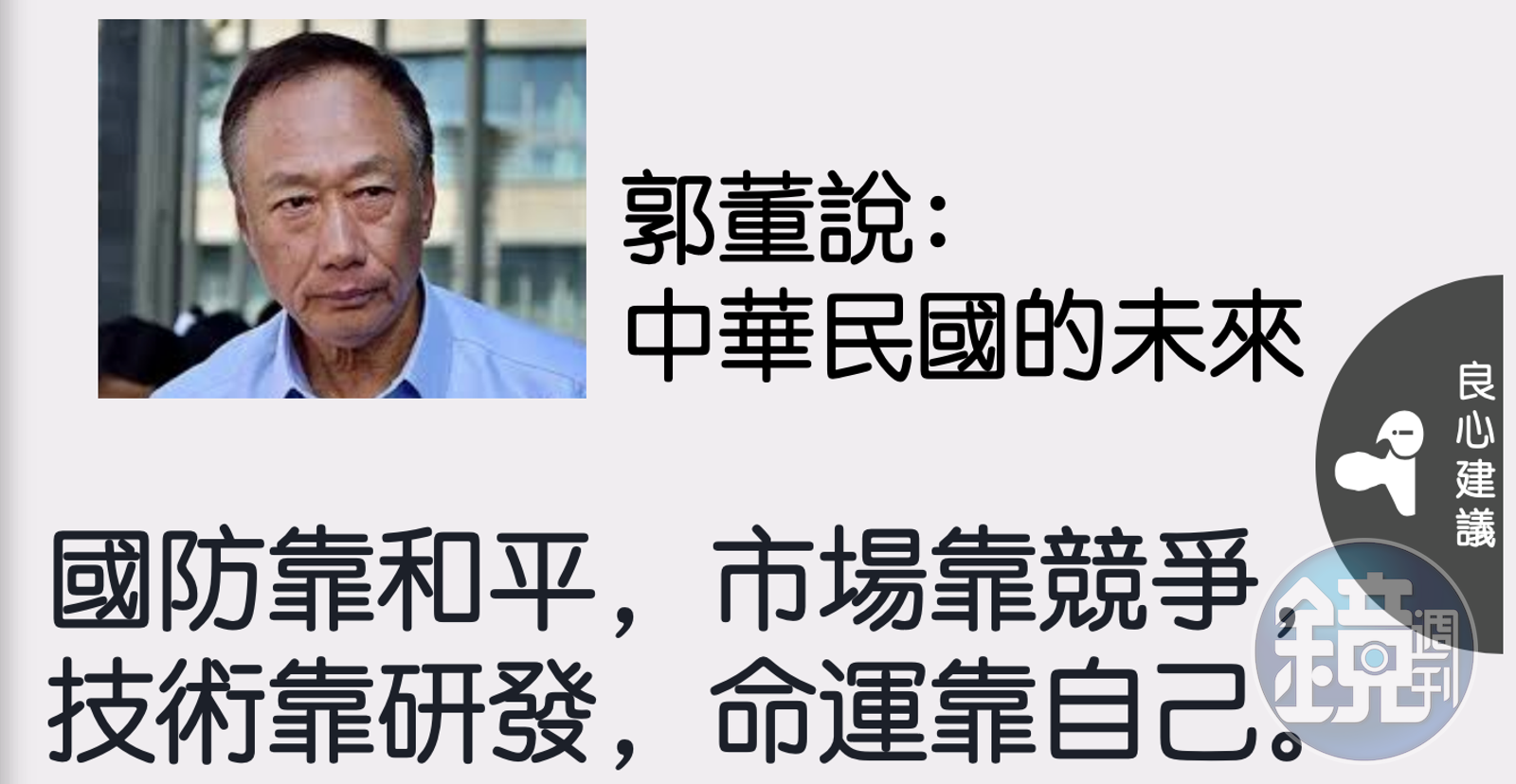 高雄市長韓國瑜13日在哈佛演講提出「國防靠美國、科技靠日本、市場靠中國、努力靠自己」,鴻海董事長則在自己臉書專頁上表達不同看法,他認為:「國防靠和平、市場靠競爭、技術靠研發、命運靠自己」,今(15日)出席美國在台協會活動再度強調,國防靠美國是靠不住的,這麼多年來,有哪個國家國防靠美國,最後是安全脫身?中國民國、韓國、越南,還不要講很多歐洲國家,國防要靠和平。