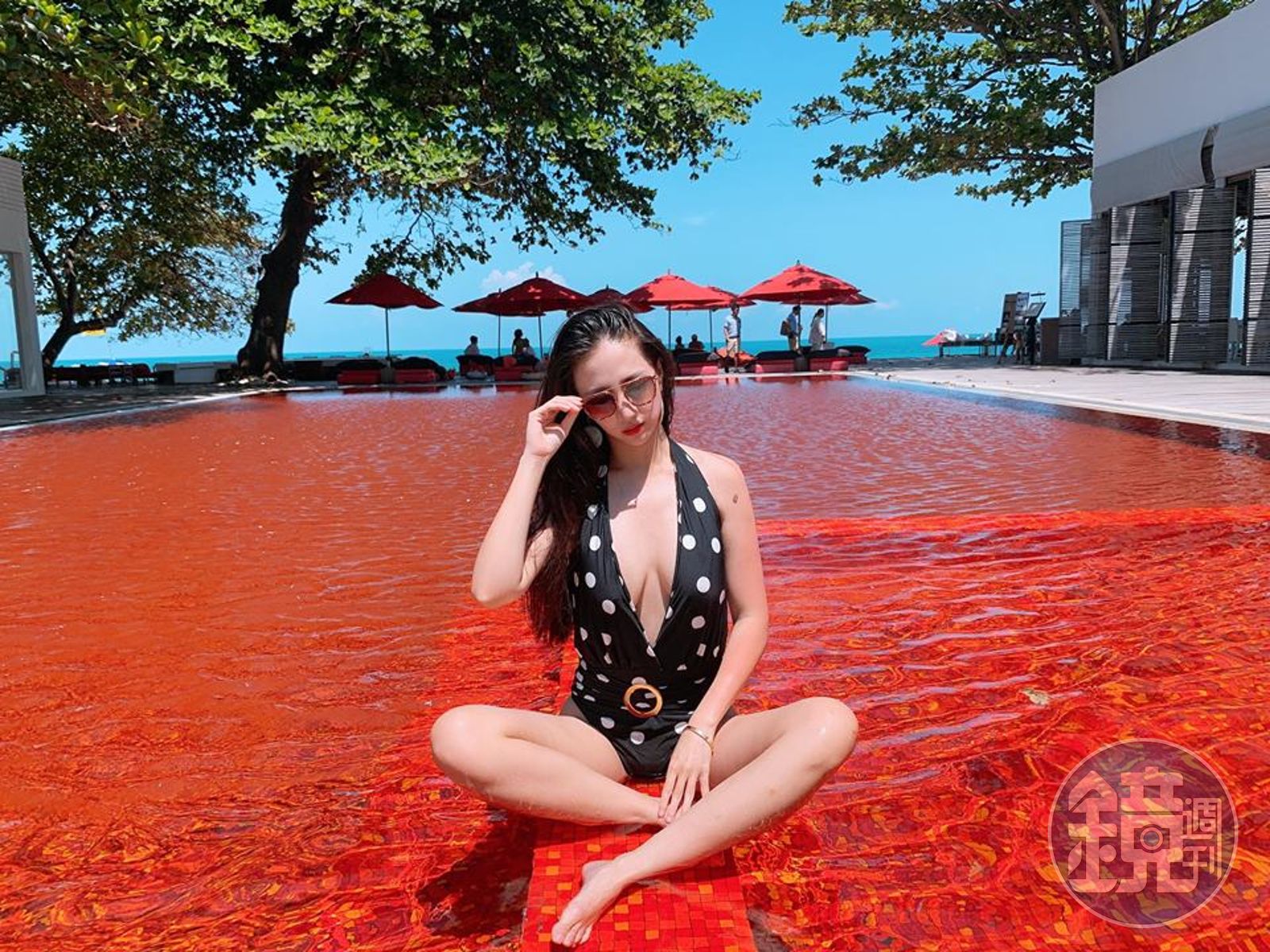 疑似太陽曬過頭的林采緹,則在貼文寫道:「泳池紅了,我身體也紅了!」