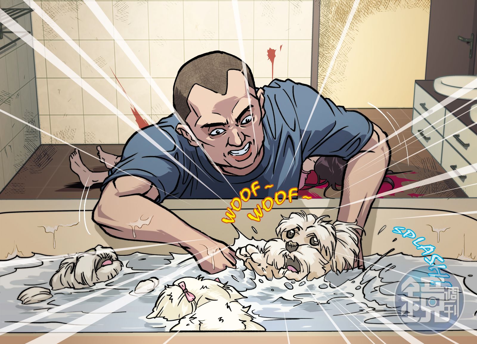3隻愛犬見主人慘死刀下,拼命狂吠,已經精神狂亂的李明哲,只感到狗叫聲吵得他腦筋快要爆炸,於是他放下刀,把浴缸放滿水,親手抓著小狗,一隻隻溺斃,再將人狗屍體硬塞進預藏的行李箱,搭車回台中住處藏屍,整個過程都被監視器錄下來,只是當時見到他的人,誰也想不到裡面裝著1人3犬屍體。