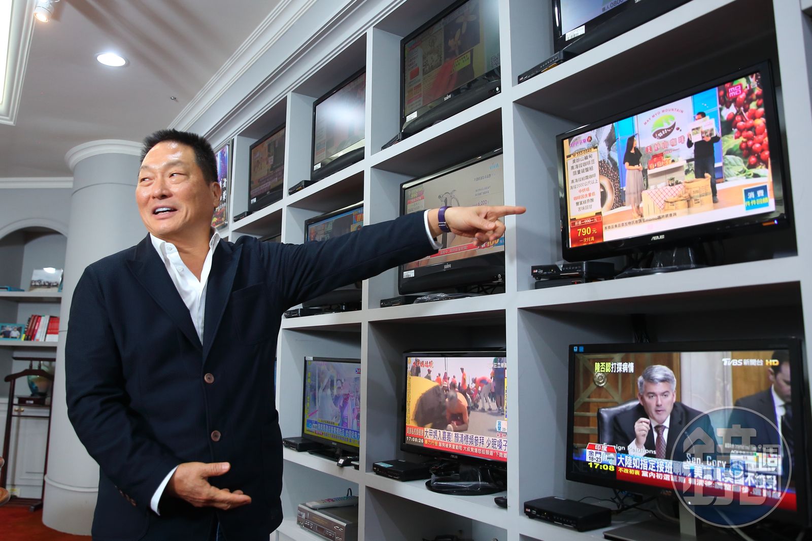 王令麟辦公室內有13台電視,讓他隨時監看自家及競爭對手的頻道。發布時間:2019.04.17 14:38 臺北時間