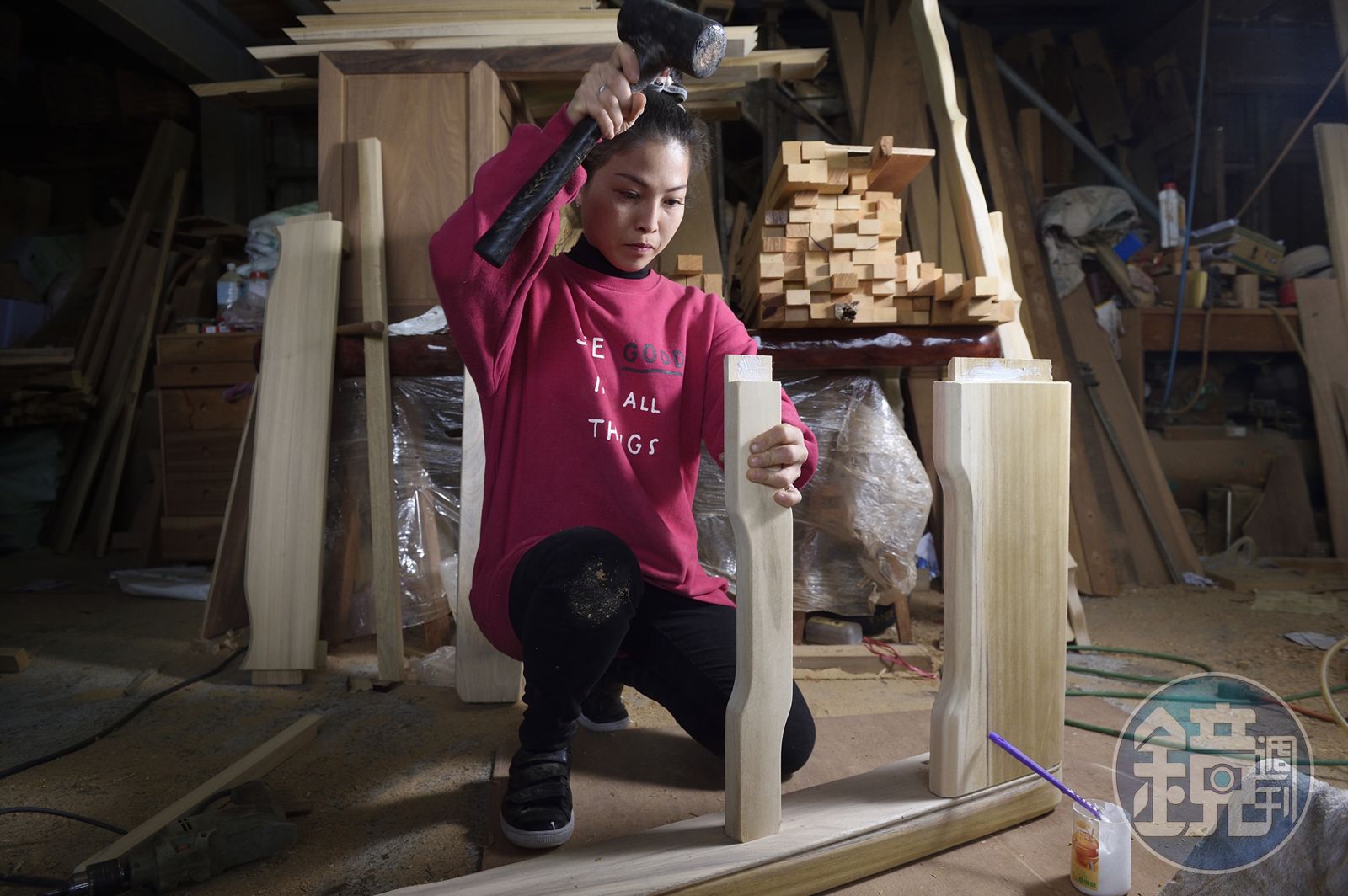 「我阿爸堅持白標(樹皮)不能用,一定會蛀。好的神桌用2代人都不會壞,說不定地震躲在底下也不會塌。」她繞過散落地面的木料與成堆木屑開始今日工事,「10幾年前爸爸就都放手讓我做了。」