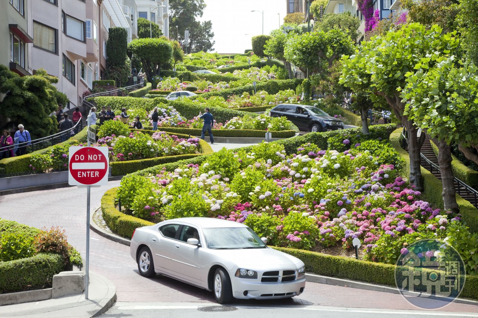 舊金山因起起伏伏的城市街道相當著名,而倫巴底街(Lombard Street)因斜坡車道被設計成8個急轉彎,因此被命名為「九曲花街」,是影視劇熱門的拍攝景點,也是遊客嚮往的旅遊勝地。