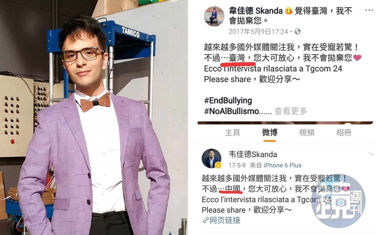 韋佳德精通華語和義大利語,讓他在歡迎外國人的台灣很吃香,但近來雙面手法頻被揭穿,例如韋佳德就曾在台灣使用的臉書寫「越來越多國外媒體關注我,不過台灣您大可放心,我不會拋棄拋棄你」,在對岸使用的微博,韋佳德又將「台灣」換成「中國」,被疑兩面討好。還有網友挖出,他在義大利節目自稱是「第一個在亞洲走紅的西方人」有膨風膨過頭的嫌疑。