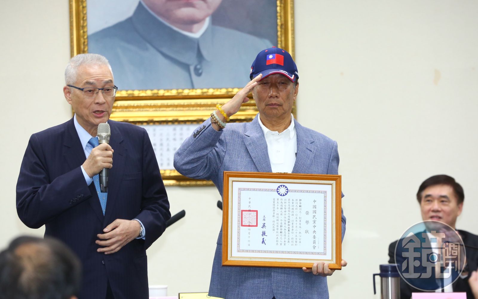 「請容許我向國父遺像敬三鞠躬禮,我每年年終尾牙都一樣的工作,做20幾年了,而且還要念國父孫文的總理遺囑。」在接受榮譽狀之前,郭台銘向現場國民黨黨員和媒體說道。
