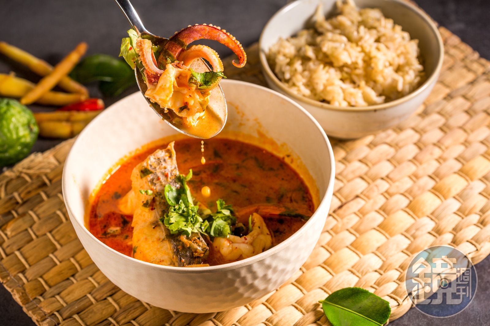 泰式冬蔭功「酸辣海鮮湯」風味濃郁,泰國人並不當湯喝,而是拌飯,自製蝦膏提出湯鮮味甜。(480元/份)