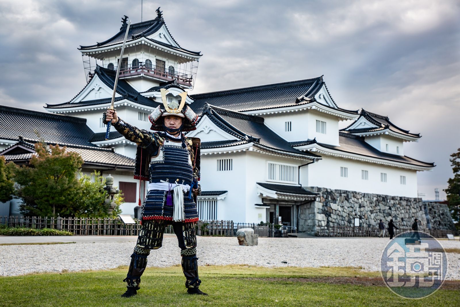 如果想要化身武士,走到戶外於富山城前留下難得合照,那就得事先預約正式版全套的盔甲體驗,每日限4組、8人、可上網先預約。全副武裝的盔甲穿載起來相當費勁,總共要花費40分鐘,從換鞋開始,膝下綁著護布、腰上綁上整片胄甲…,繁複的程序,只能靠工作人員幫忙由下而上、一層層穿戴,等到全身著裝完畢,最後戴上華麗頭盔,此時身上裝備已近20公斤。
