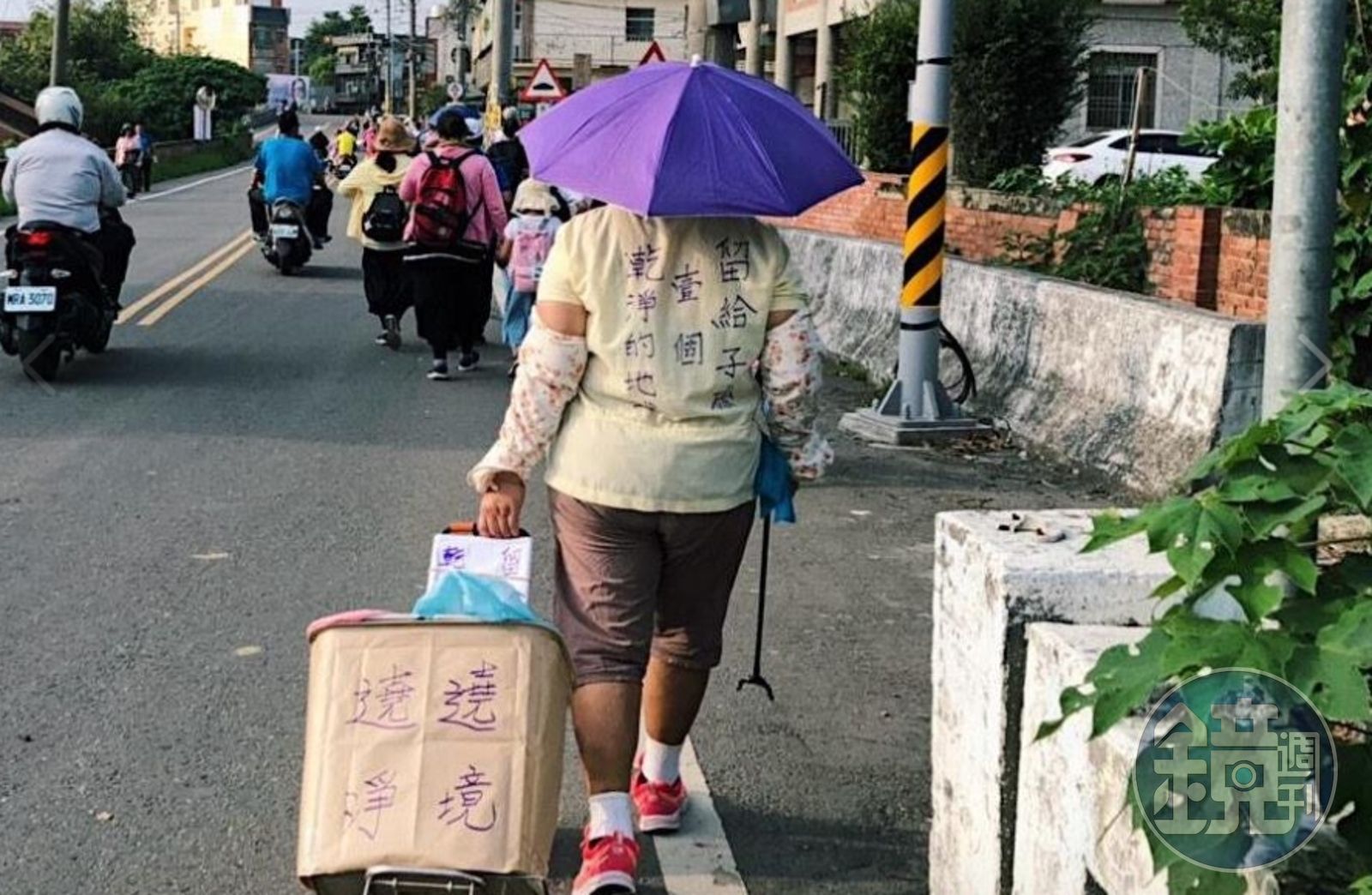 大甲媽祖遶境剛告一段落,臉書粉絲專頁「島內散步」則分享一張照片,照片裡的女士頭戴小雨傘,身穿「留給子孫壹個乾淨的地球」T恤,左手拖著一個寫著「遶境 遶淨」的箱子在路上走著,「島內散步」表示,一開始看到這位媽媽靠在河堤旁休息,看起來很疲倦,以為是一般拖著行李的香客,突然她開始往前走,才看見她身上的口號。