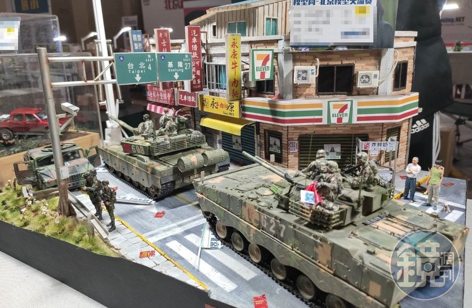 臉書粉絲專頁「世界特種部隊與軍武資料庫」昨(18日)貼出多張照片,表示北京模型展交流賽有一組作品一擺設好,就引發討論。這組作品「台北不設防」,從照片中可以看到解放軍坦克駛進台北街頭,路旁除了常見的便利商店,還有永康牛肉麵和士林十全排骨等店家。