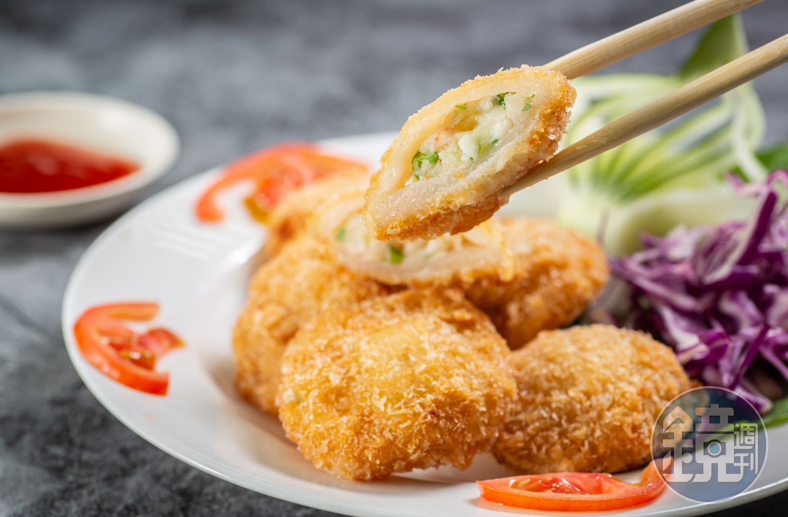 米其林必比登特別推薦義興樓的「金錢蝦」,這是日治時期的酒家菜,不同於現存的辦桌菜或南部老餐廳保有用豬網油包餡的蝦餅手法,這裡把豬背油剖成袋狀夾入劍蝦、魚漿、荸薺等,再裹粉炸成金黃小餅,全程手工製作,每塊大小厚薄略有不同,盛盤前配著小黃瓜雕花、番茄片一起登場,完全展現2、30年代樸實菜色裡的料理人心意。