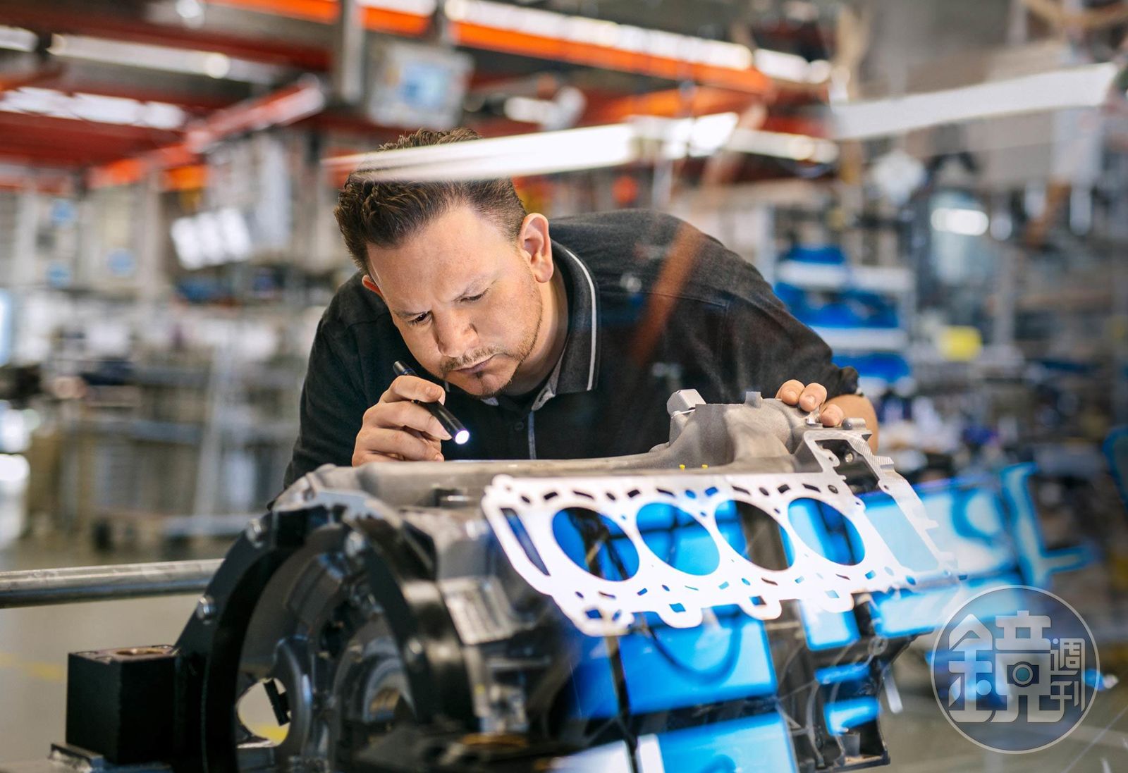 AMG主張的One Man One Engine,指的是一個人負責組裝一顆引擎。不像一般引擎,在生產線上透過好多人分階段組裝,當一位AMG技師完成組裝,就會貼上一塊簽名牌以示負責。造訪過AMG總部,我敢說,一人一引擎的AMG真的讓人很有感(如果你打算買AMG的話),但仔細看,AMG工廠裡有著一應俱全的現代化製具與設備,鎖螺絲、上磅數、丈量間隙、油底殼塗膠…這些耗時工序都可以快速完成。