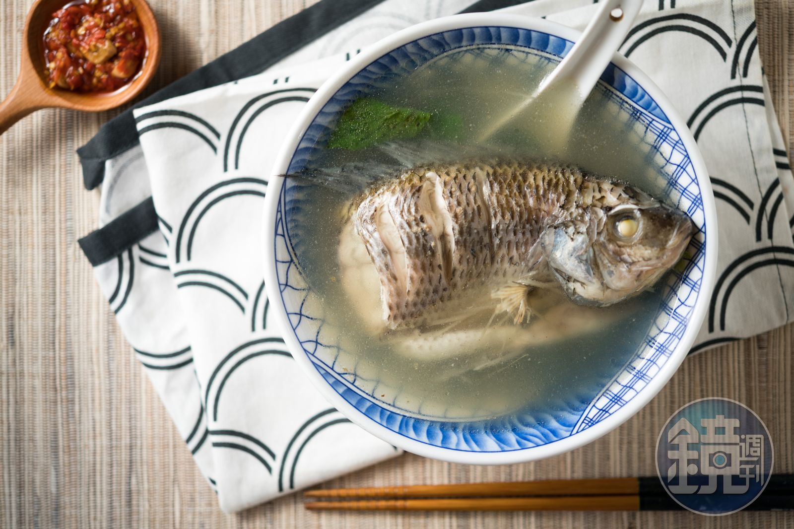 「我們做的是路邊攤,以平價為主,選的是淡水吳郭魚,1碗鮮魚湯配上1盤麵,一百塊就可以吃飽。」1碗魚湯銅板價,就是一整尾魚,鮮魚放入由豬大骨熬成,再加上一點鹽提味的湯底中,咕嚕咕嚕滾著,雖然選的並非昂貴魚種,但為避免吳郭魚的土味過重,當天由魚販送來、清過一遍內臟的吳郭魚,老闆還會仔細地逐條清洗、再清過一次內臟和魚鱗。