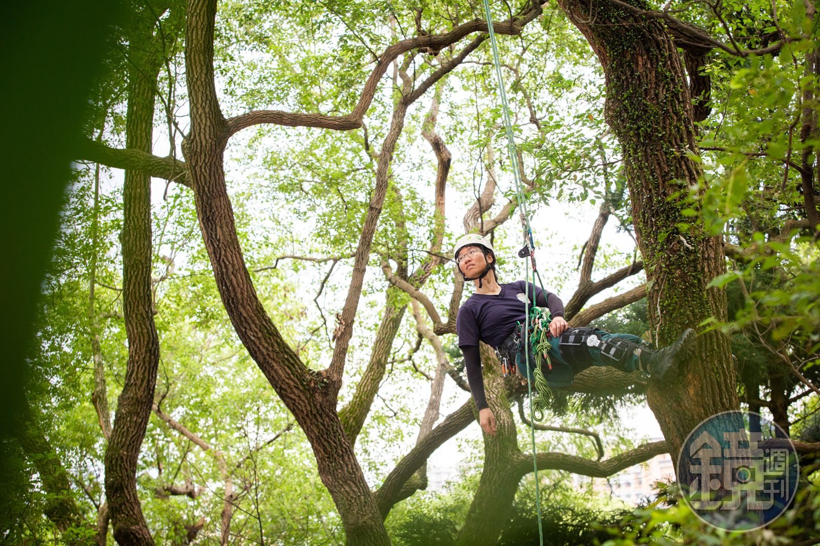 這天我們攀登的是年輕的樟樹,大約30至50歲。陳雅得在陌生人面前話不多,但靠近樹木就變活潑,熱心指導我們繩子該怎麼拉。只是人上升到某個高度以後,智商會急速降低,我們連活結都忘了該怎麼打。她講話時總是慢慢的,但拖著冰攀受傷的右腳還是很矯捷。她指著樟木身上久遠的傷口,忍不住稱讚:「癒合得很好,可見生命力很強。」